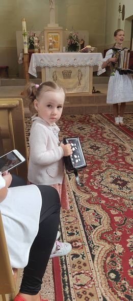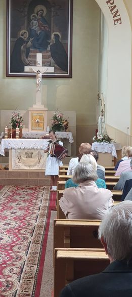 Deň pred vystúpením - vo štvrtok 26.05.2022 o 08.30 hod, na sviatok Nanebovstúpenia Pána, bola za našich jubilantov odslúžená vo farskom kostole sv. omša, ktorej sa mnohí zúčastnili. Po sv. omši vystúpila s krátkym programom pre jubilantov heligonkárka Simonka Halvoníková.