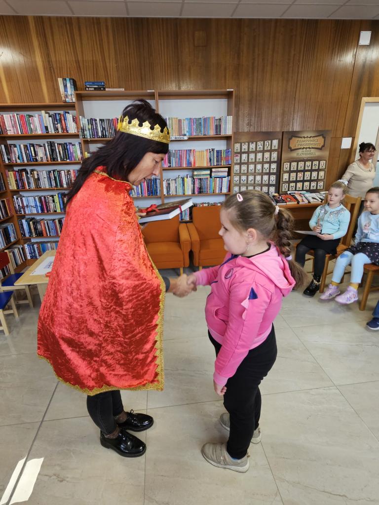 Na začiatku detičky zložili pripravený sľub a slávnostného aktu „pasovania za čitateľov“ sa ujala p. starostka Mgr. Renáta Majchráková, ktorá im osobne odovzdala „pasovaciu listinu“, malý darček a zablahoželala k prvému kroku na ceste ku knihám.